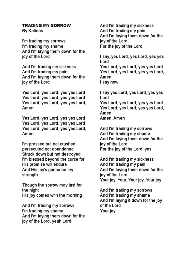 Im trading my sorrow Im trading my shame Im laying them down for the joy of the Lord Im trading my sickness Im trading my pain Im laying them down for the joy of the Lord Chorus. Through the sorrow may last for the night. And Im trading my sickness.
